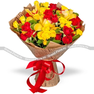 Улыбка весны – букет с кустовыми розами и хризантемами