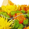 ЛЮКС: хризантема одноголовая желтая - 5 шт., роза оранжевая - 4 шт., роза желтая - 3 шт., альстромерия оранжевая - 4 шт., хризантема кустовая зеленая - 4 шт., фетр оранжевый. Примерный диаметр букета 40х40 см.