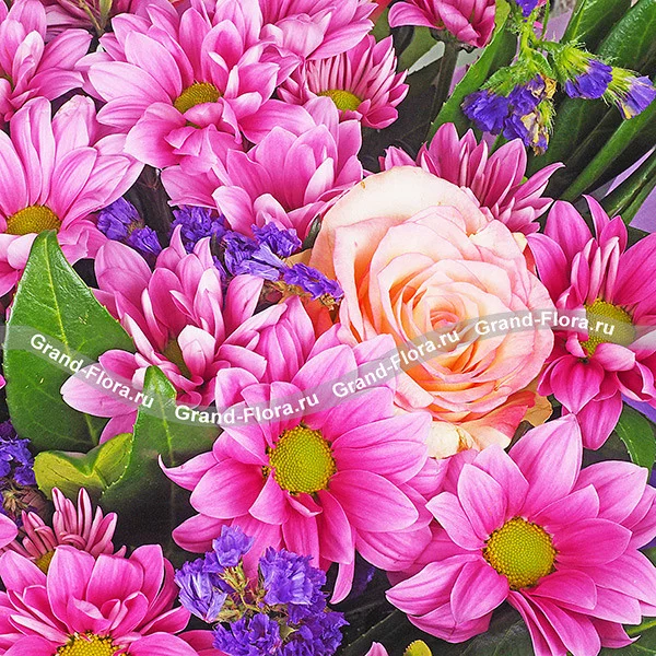 ДЕЛЮКС: хризантема кустовая фиолетовая - 10 шт, роза розовая - 9 шт, статица - 5 шт, салал, фетр фиолетовый, бант. Примерный размер: 45Х45 см.