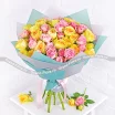 Букет выполнен из кустовых розовых роз, поражающих своей нежностью и желтых кустовых роз, солнечных и согревающих самые отдаленные уголки души. Копозиция обернута в стильную упаковку и перевязана лентой. Высота букета от 30 см, а диаметр от 25 см до 35см, в зависимости от выбранного Вами варианта букета. Обращаем Ваше внимание, что состав и оформление букета могут отличаться.
