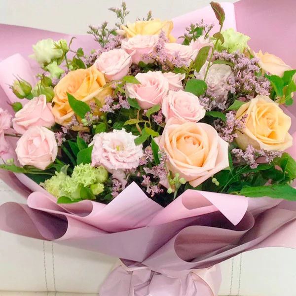 роза кремовая/персиковая – 5 шт., эустома розовая – 5 шт., роза сиреневая кустовая (возможна замена на розовую)– 5 шт., упаковка, лента.