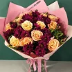 Уменьшенный: роза кремовая/персиковая(персиково-розовая) - 3 шт., хризантема фиолетовая - 2 шт., декоративная зелень, упаковка, лента. Примерный размер: 20Х20 см.